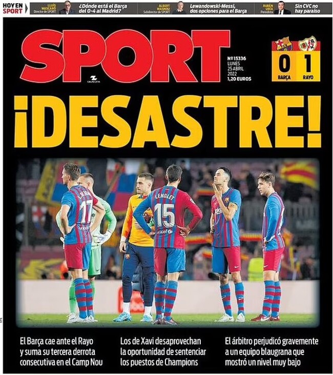 현지 언론들도 비판을 쏟아냈다. 스페인 매체 ‘스포르트’는 일간 신문판 표지에 ‘재앙’이라는 문구를 적으며 바르셀로나의 부진한 경기력을 꼬집었고. 스페인 ‘마르카’는 “이번 패배로 바르셀로나는 레알 마드리드의 리그 우승을 지켜볼 수밖에 없게 됐다”라고 비판했다.